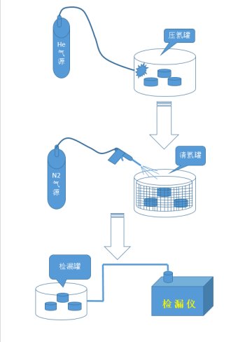 一般压氦法检漏时采用排除法。在夹具中放一定数量的器件,这一批的总漏率没超过报废预定值,说明这一批合格;总漏率超过报废预定值可以取出一半,剩下的一半继续检漏,这一半合格说明有漏的器件在取出的那一半中,依此检漏直至检出有漏孔的器件。